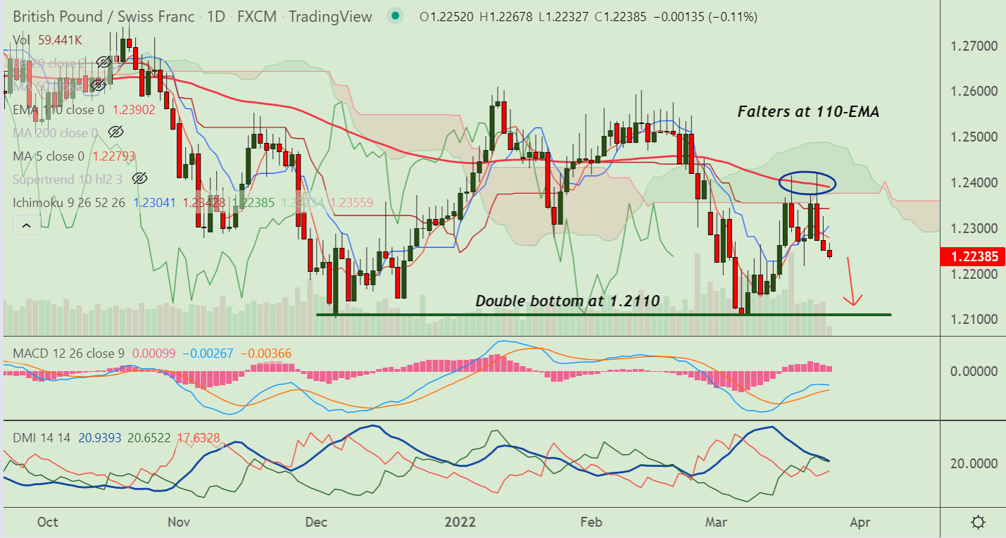 Summary: GBP/CHF trades with a bearish bias. Scope for test of Double Bottom at 1.2110.