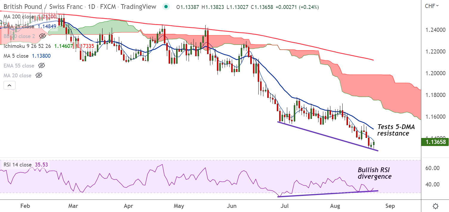 GBP/CHF was trading 0.18% higher on the day at 1.1359 at around 10:35 GMT. The pair is extending previous session's bounce off trendline support. However, upside remains capped at 5-DMA. Mixed UK PMIs fail to impress GBP bulls.