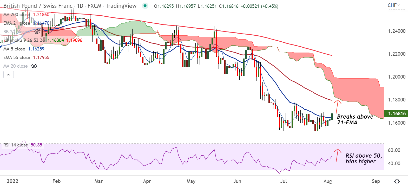 GBP/CHF has shown a break above 21-EMA which was stiff resistance, capping upside for many sessions.