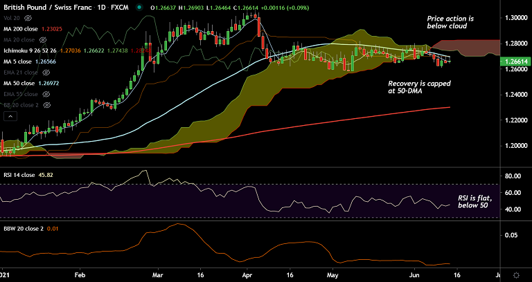 GBP/CHF is set to extend sideways grind. Stiff resistance for the pair seen till 1.27 mark. Decisive break above required for upside continuation. The pair finds major support at 110-EMA at 1.2585. Break below will drag the pair lower.