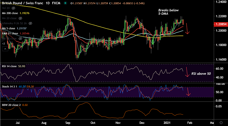 GBP/CHF slumped over 0.50% and was trading at 1.2085 at around 13:30 GMT.