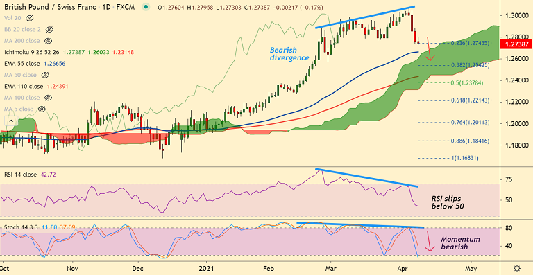 GBP/CHF is on track to test 55-EMA at 1.2666 ahead of 1.26 (cloud top) and then 38.2% Fib retracement at 1.2542.