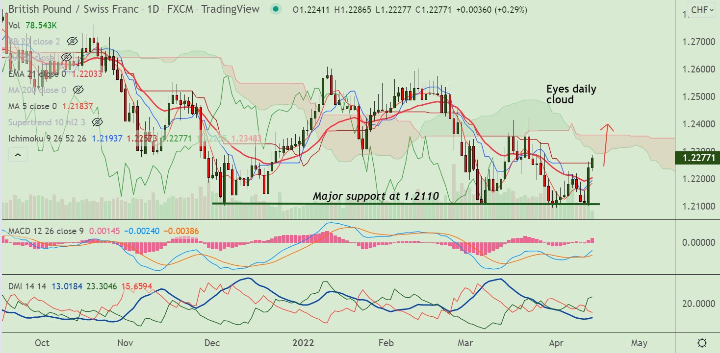 Summary: GBP/CHF on track to test daily cloud. Break above cloud will see bullish continuation.