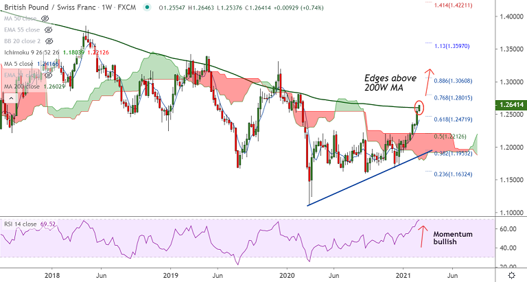 GBP/CHF was trading 0.46% higher on the day at 1.2646 at around 08:25 GMT, outlook strongly bullish.