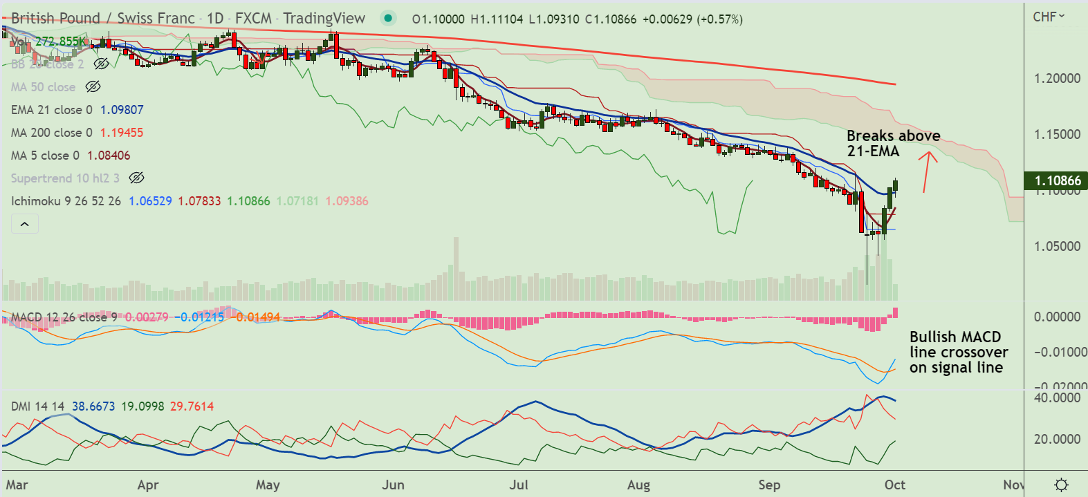 Summary: GBP/CHF spikes higher for the third straight session. Break above 21-EMA opens further upside in the pair.