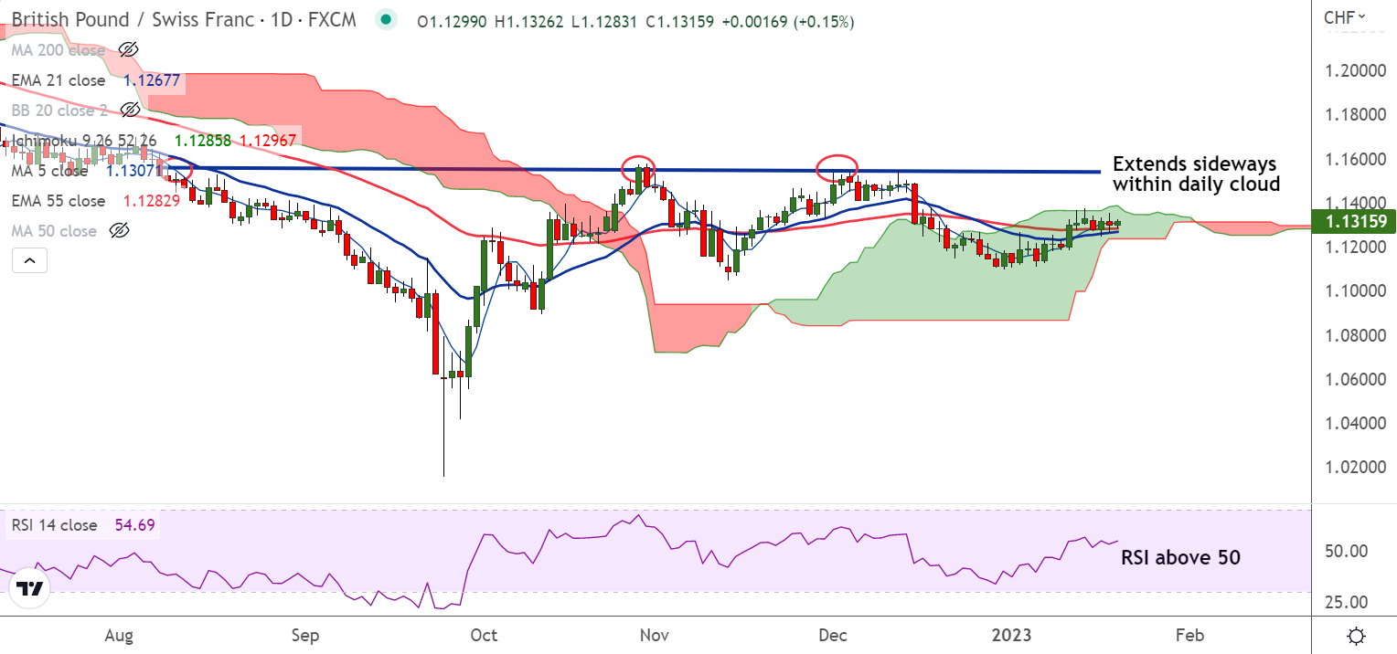 Summary: GBP/CHF trades directional within the daily cloud. Watch out for cloud break out for clear direction.