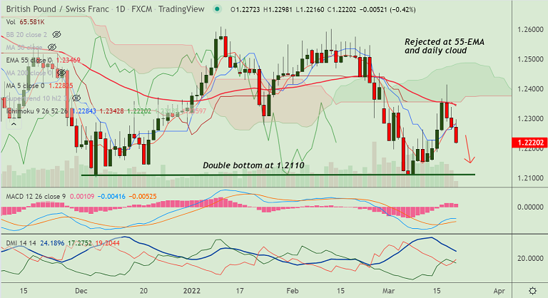 Recovery attempts were capped at 55-EMA and daily cloud resistance, upside only on break above.