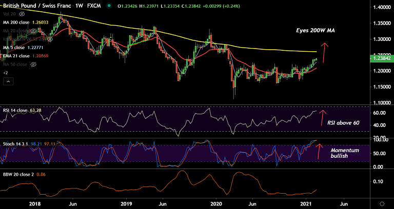 GBP/CHF was extending gains for the 5th straight session, hits new 12-month highs at 1.2397.