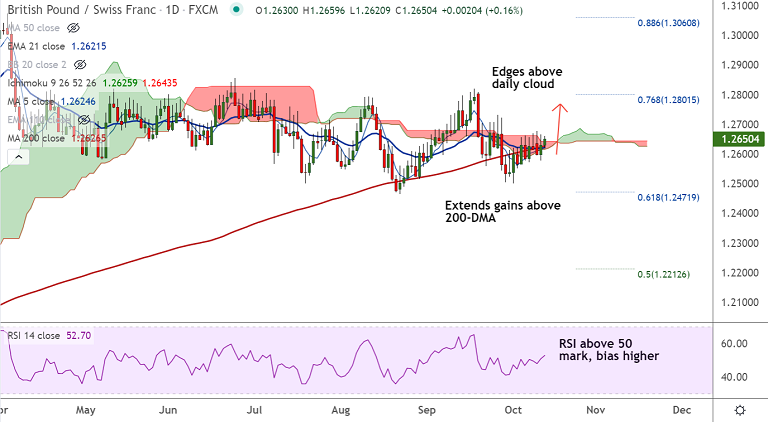 GBP/CHF was trading 0.22% higher on the day at around 1.2660 at 0820 GMT, outlook is turning bullish. The pair is trading above daily cloud and 200-DMA, scope for further gains as oscillators turn bullish.