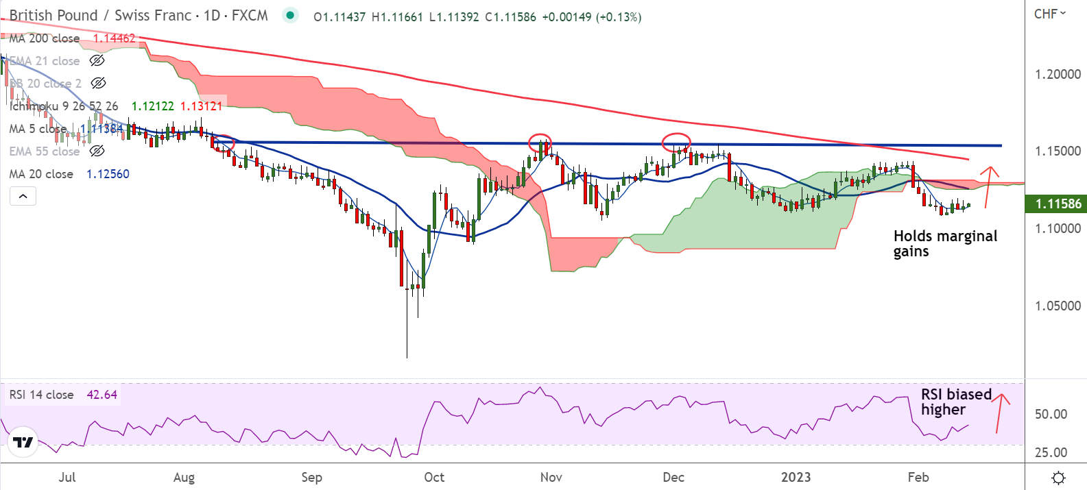 Summary: GBP/CHF has shown a break above 200H MA, scope for further upside. Daily cloud offers major resistance. Watch out for decisive break above for further gains.