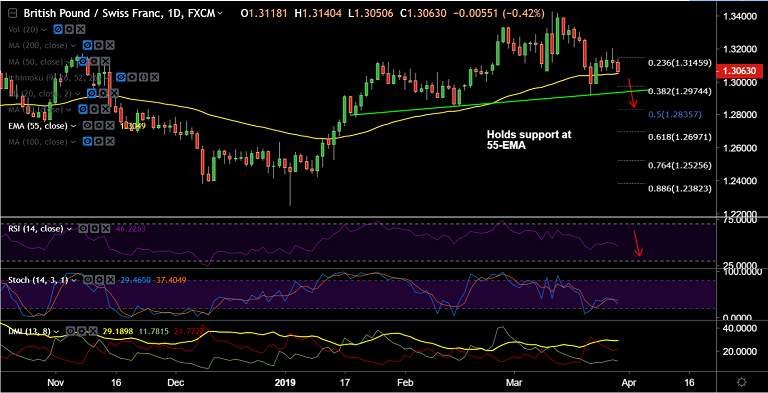 Support levels - 1.3049 (55-EMA), 1.2974 (38.2% Fib), 1.2930 (trendline)