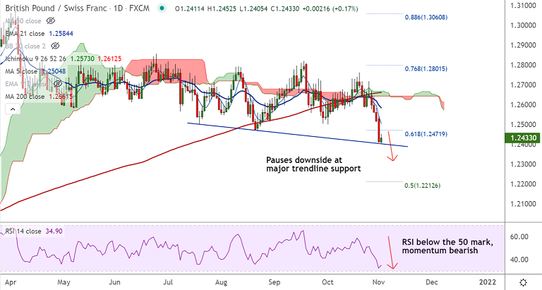 Summary: GBP/CHF recovery lacks traction. Outlook is bearish. Break below 1.24 handle will drive more weakness.