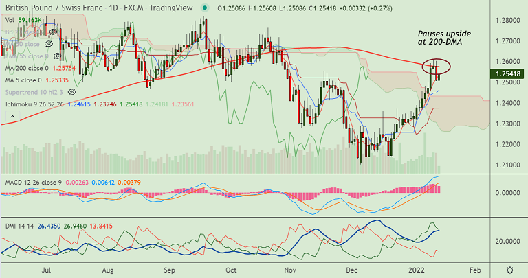 GBP/CHF rally from multi-month lows at 1.2102 has fizzled out at 200-DMA and decisive break above is required for upside continuation.