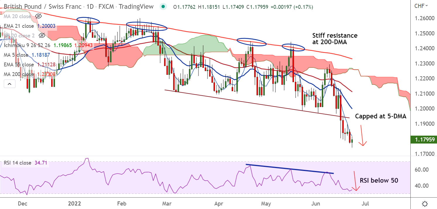 GBP/CHF trades with a bearish bias. Upside remains capped below 5-DMA which is sharply lower.