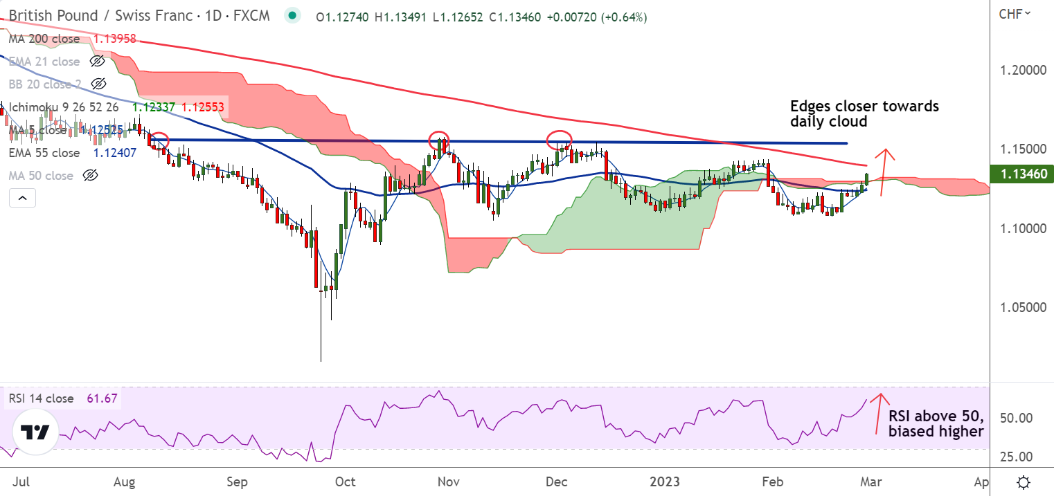 Summary: GBP/CHF poised to extend upside mometum. On track to test 200-DMA at 1.1395. Failure to close above daily cloud negates any upside bias.