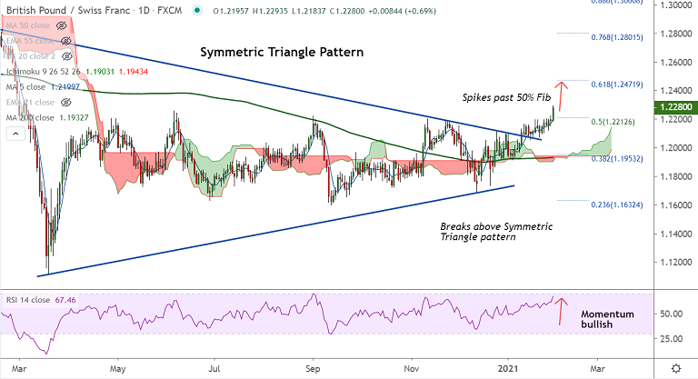 A breakout above Symmetric Triangle pattern on the daily charts keeps scope for upside in the pair. Technical indicators are also bullishly aligned.