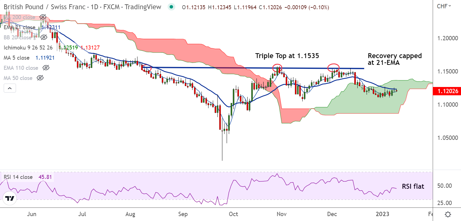 Summary: GBP/CHF finds stiff resistance at 21-EMA. Watch out for decisive break above for further upside.