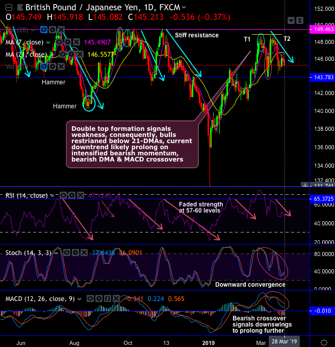 We see the stiff resistance areas of 148.874 – 149.463 levels. That is where double top formation has occurred with top 1 at 148.572 and top 2 at 148.874 levels that signals weakness in this pair (refer daily plotting). Consequently, the interim bulls are restrained below 21-DMAs.
