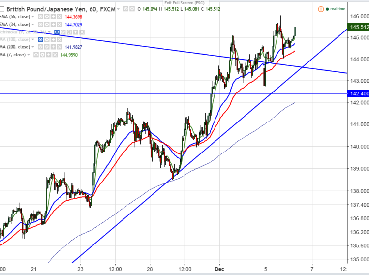 - GBP/JPY has taken support near 55- H MA and started to jump from that level. It is currently trading around 145.39.