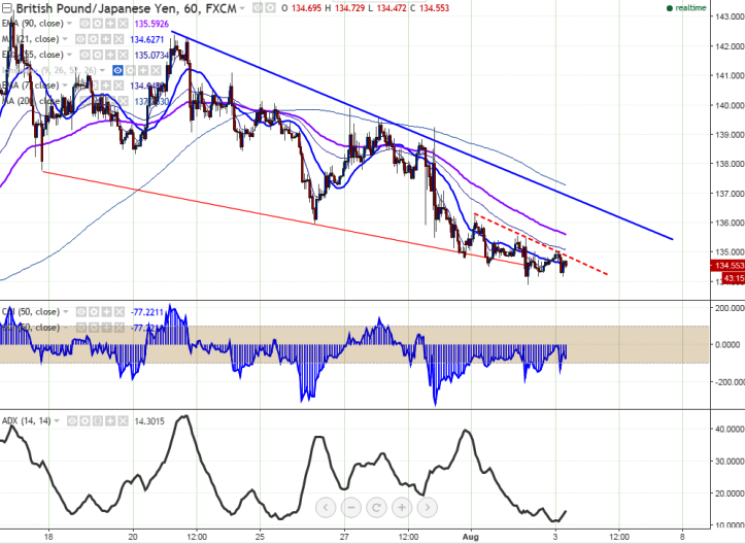 - The Intraday trend is weak as long as resistance 135.62 holds. The pair is declining continuously for the fifth straight session from the high of 140. GBP/JPY is trading weak and market awaits UK PMI data which is to be released today for further direction.
