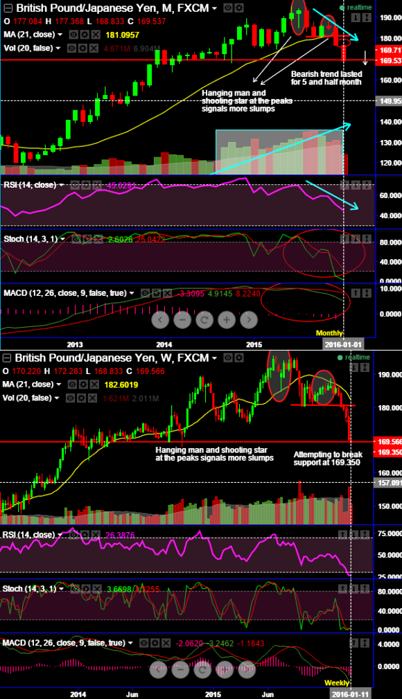 Currently, it is attempting to break a very strong supports at 169.350 with leading oscillators converging these bearish sentiments.