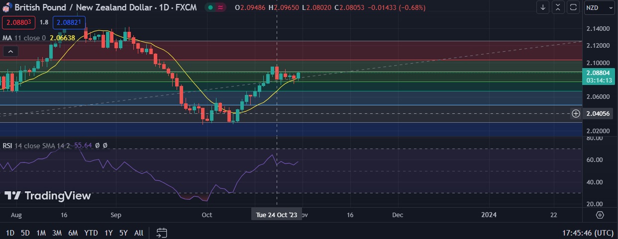 • Pair traded in 2.0838/2.0957 range ,a close above 38.2%fib, will trigger a new bullish phase with potential for 2.1000