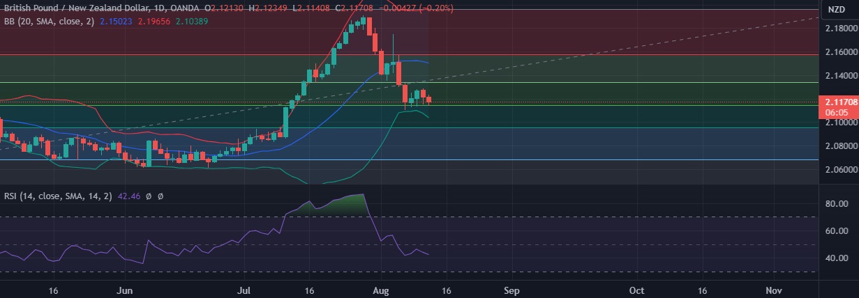 • Immediate support is seen at 2.1148(50%fib) and break below could take the pair towards 2.1038 (Lower BB).