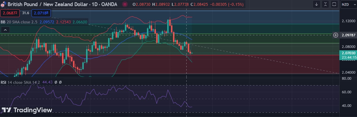 • Strong support is seen at 2.0665 (23.6%fib) and break below could take the pair towards 2.0593(Lower BB).