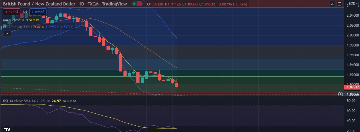 • At GMT 17:09, the pair was trading 0.42% lower at 1.8953. The cross pairs bearish bias is set to strengthen, likely to drop towards 1.8820