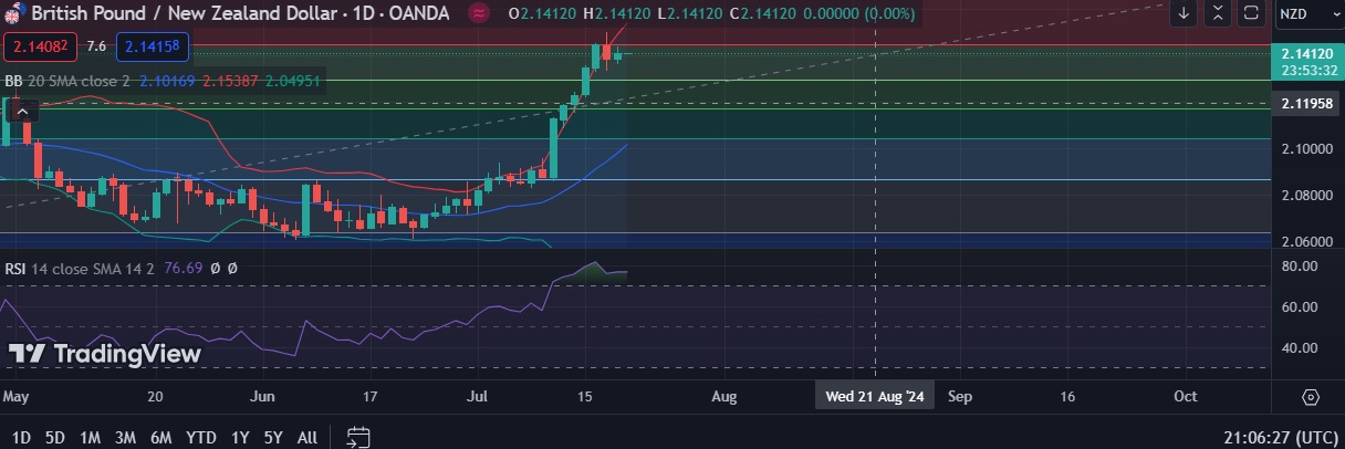 • Immediate resistance is located at 2.1447 (23.6%fib ), any close above will push the pair towards 2.1527 (Higher BB).