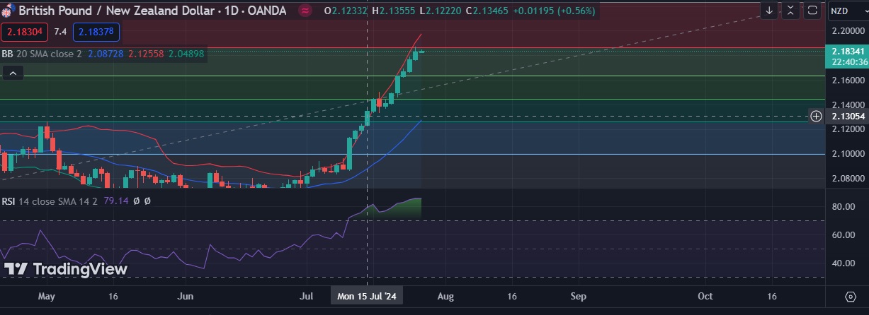 • Immediate resistance is located at 2.1872 (23.6%fib ), any close above will push the pair towards at 2.1913 (Higher BB).