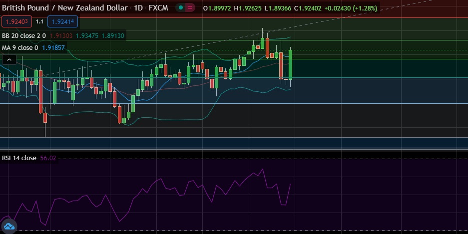 •The pair hit daily high at 1.9258 and was last trading at 1.9255 at (GMT 18:31). GBP/NZD has seen sufficient correction to allow resumption of uptrend.