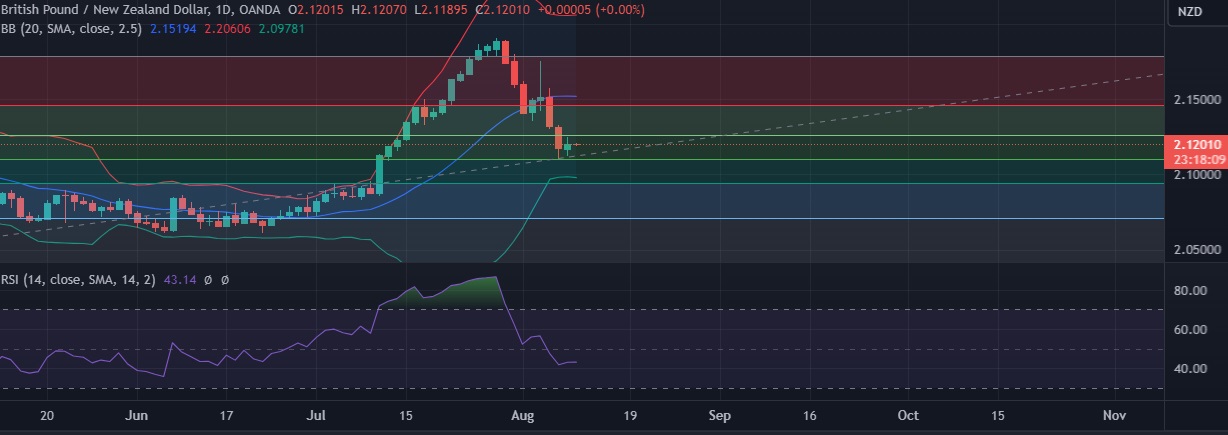 • Immediate support is seen at 2.1106(50%fib) and break below could take the pair towards 2.0977 (Lower BB).