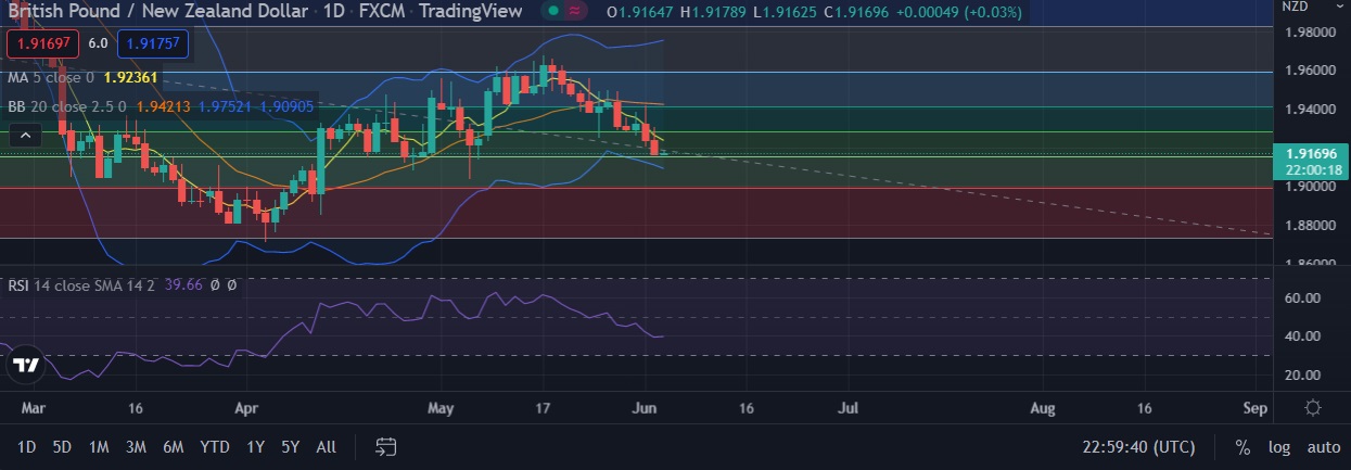 • Strong support is seen at 1.9147 (38.2%fib) and break below could take the pair towards 1.9092 (Lower BB).