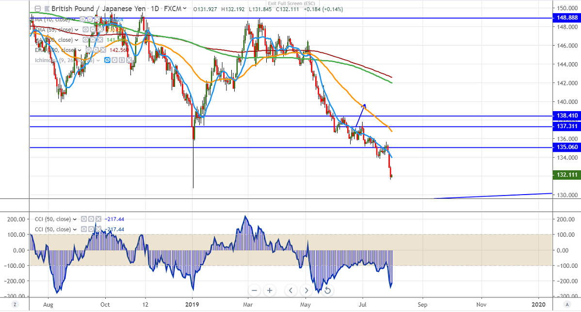 GBPJPY continues to trade lower for 3rd consecutive day and lost more than 400 pips from high of 135.67. The major downside was due to huge selling in GBP on the chance of no-deal Brexit fears intensifies.