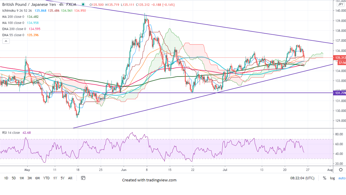 GBPJPY showed a minor decline of more than 100 pips from a high of 136.62 on a slight decline in Pounds sterling. GBP lost more than 50 pips against USD despite strong UK retail sales. The retail sales came at 13.9% MoM in June compared to a forecast of 8.5%. The Core Retail Sales for the UK climbed 13.5 MoM. The intraday trend is still on the higher side as long as support 134.12.