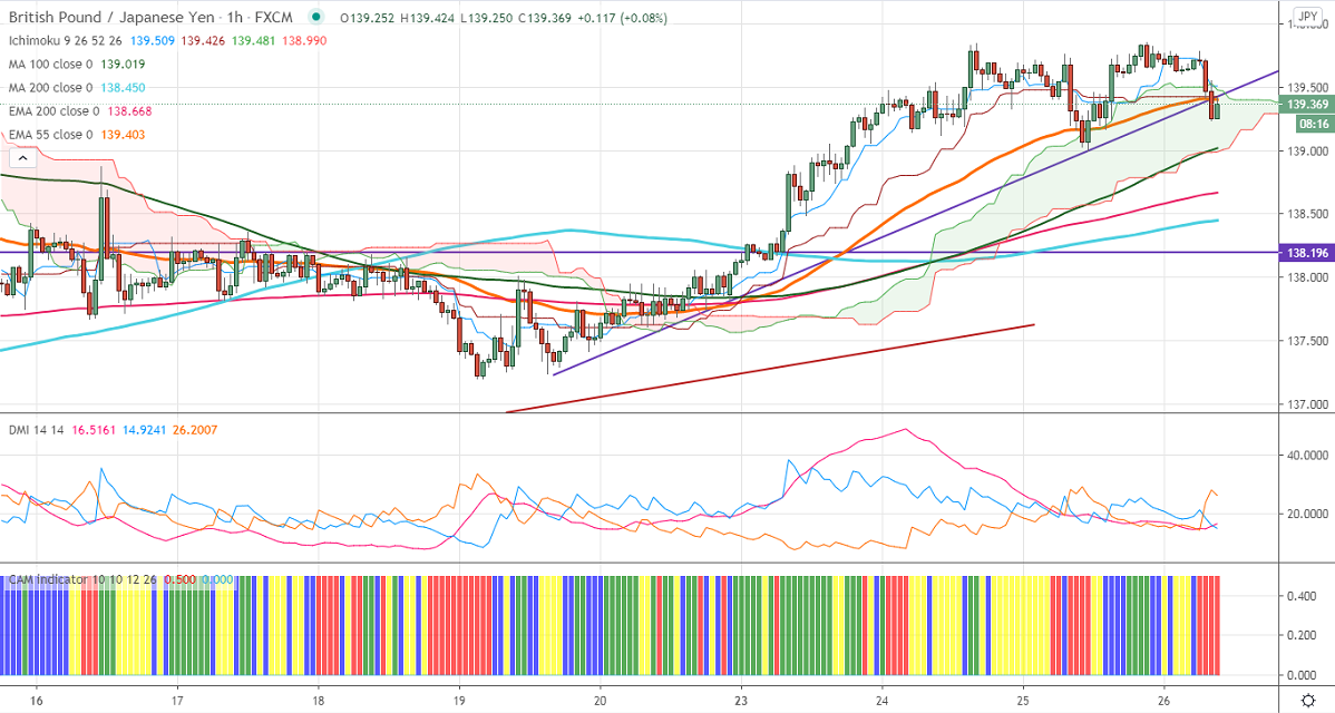 GBPJPY has formed almost a double top near 139.85 in the hourly chart. It has started to decline on the strong yen. USDJPY continues to trade weak after forming a minor top at 104.76. The pound sterling has shown a minor sell-off after the European commission president said that a no-deal Brexit remains a possibility.