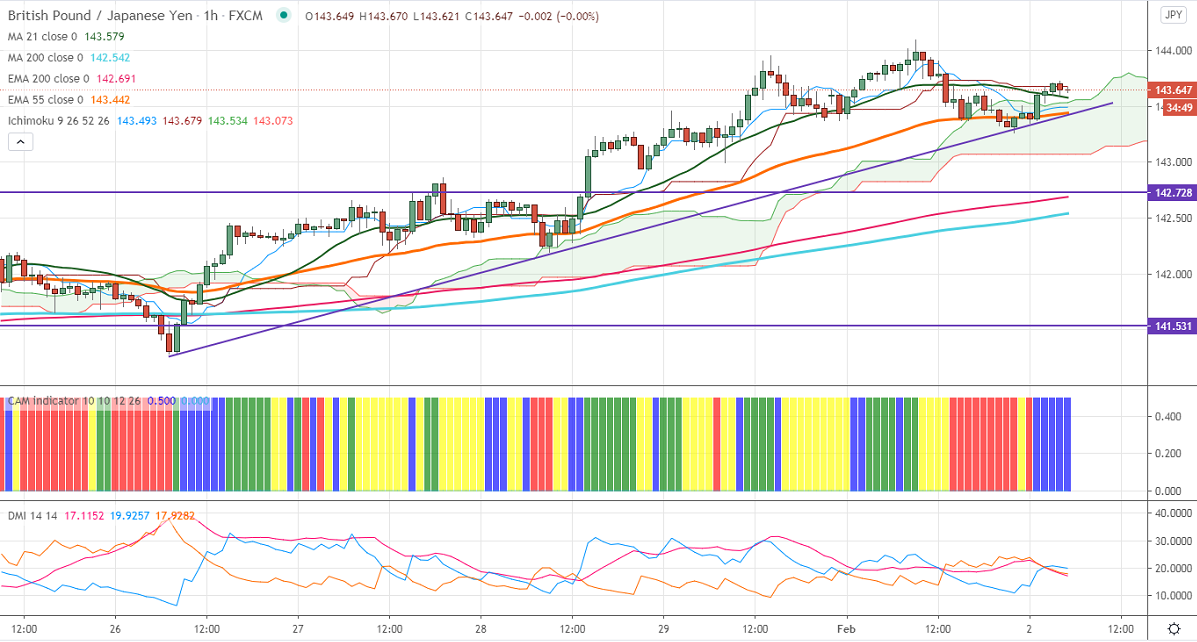 GBPJPY has taken support near the trend line and shown a recovery of 50 pips. The weakness in yen due to an increase in demand for risk appetite. USDJPY is holding well above 55- day EMA, with a significant trend reversal only above 105.67 (200- day MA). The Intraday trend of GBPJPY is bullish as long as support 142.50 holds. The pair is holding above significant resistance 142.71 confirms that the decline from 147.95 got completed at 123.58.