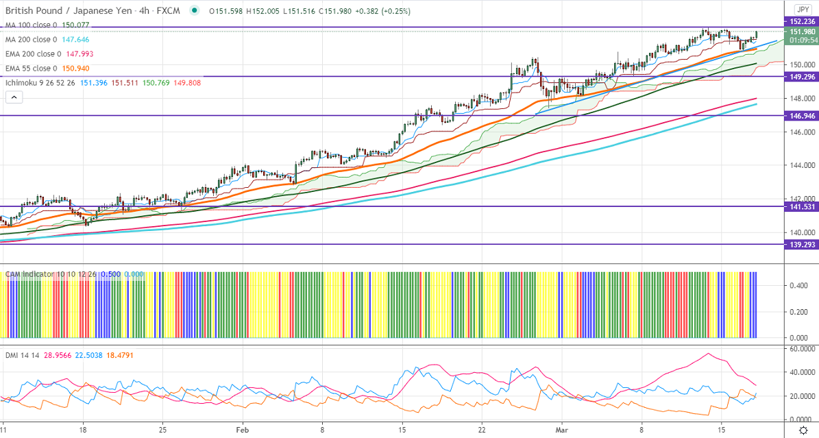 GBPJPY has recovered sharply after a minor dip below 200-H MA. The pair has halted its three days of losing streak on a minor jump in Pound sterling is trading lower after forming a temporary top around 152.235. The pair has halted its 3- weeks of the bullish trend. The minor weakness in the pound sterling against the USD is putting pressure on this pair at higher levels. USDJPY continues to hold above 200-W MA, any violation above 109.35 confirms a bullish continuation. The intraday trend of GBPJPY is bearish as long as resistance152.25 holds.