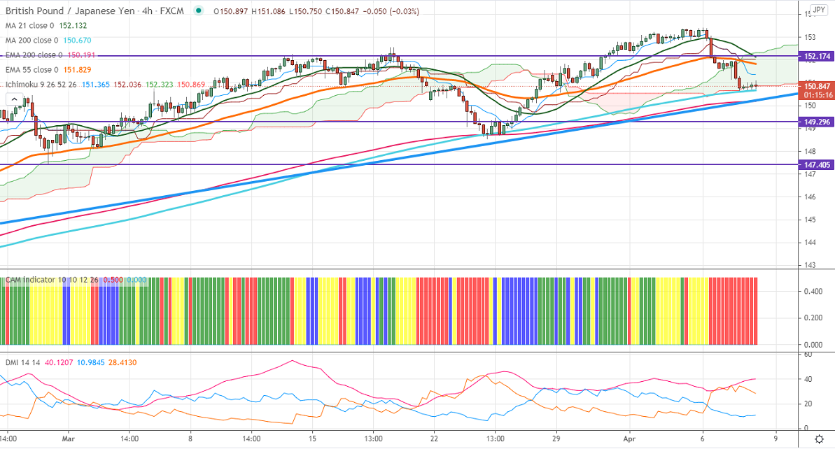 GBPJPY continues to trade lower for third consecutive days and lost more than 250 pips on pound sterling weakness. GBPUSD is trading weak after UK authorities said the risk of blood clots due to the AstraZeneca vaccine is higher under the age of 30. The UK Markit services PMI came in at 56.30 for Mar compared to an estimate of 56.8. USDJPY is still in bearish mode and holding below 110 on a slight increase in demand for safe-haven assets. The intraday trend of GBPJPY is bearish as long as resistance 151.20 holds.