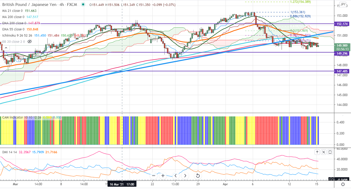 GBPJPY has formed a double bottom around 149.58 and shown a minor recovery. The slight strength in the yen is putting pressure on this pair. USDJPY declined after Powell's optimistic view on the economy. Any break below 108.75 (200-4H MA). GBP is holding above 1.3750 levels on broad-based US dollar selling. The intraday trend of GBPJPY is bearish as long as resistance 151.20 holds.