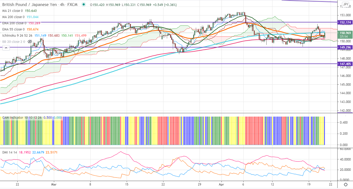 GBPJPY has halted its five days of the bullish trend and declined more than 150 pips on broad-based Yen buying. USDJPY hits multi-week lows on declining US bond yield. Any dip below 107.90 confirms a bearish continuation. The reduced hopes of a rate hike by the Fed and fast vaccine rollout is putting pressure on the US dollar. GBPUSD declined more than 70 pips from a seven-week high on surging coronavirus cases and mixed UK data. UK CPI came at 0.70% in Mar compared to a forecast of 0.8%. The intraday trend of GBPJPY is bullish as long as support 150.30 holds.