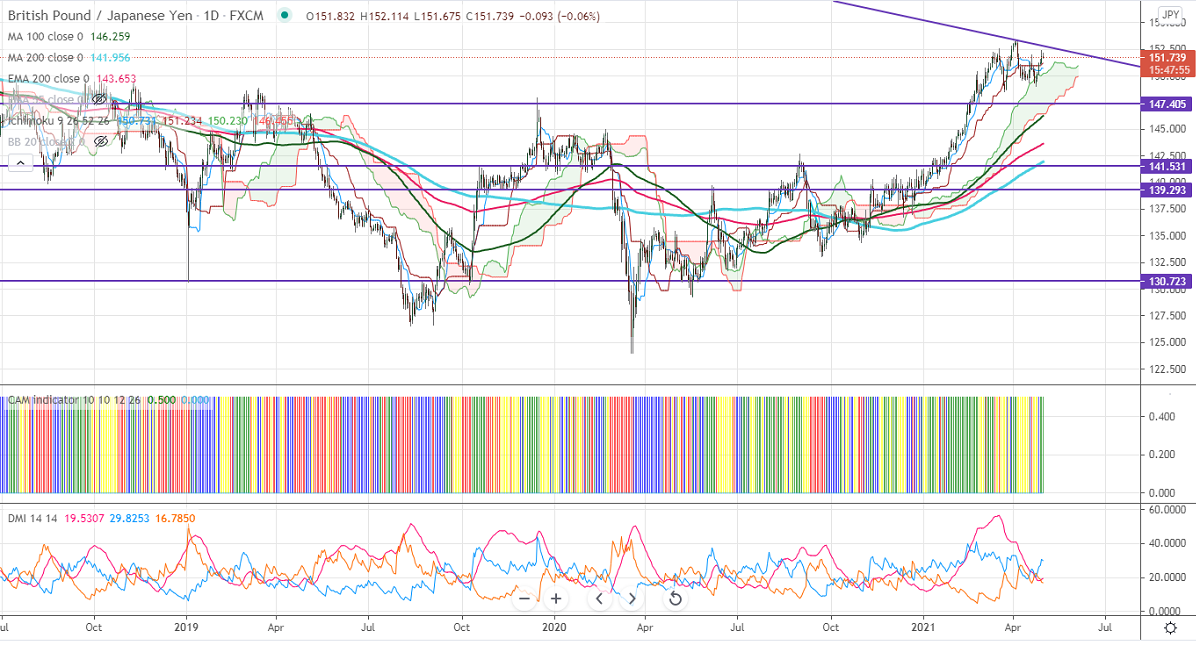 GBPJPY has shown a minor sell-off after a jump of 152.40. The pair was one of the best performers this week and surged more than 250 pips on weak Japanese yen. The upbeat market sentiment and bullish US bond yields are dragging the Japanese yen. USDJPY is facing strong resistance around 109.25, any break above confirms a bullish continuation. GBPUSD is consolidating in a narrow range for the past two days. It should break 1.4000 for further up move. The intraday trend of GBPJPY is bullish as long as support 151 holds.