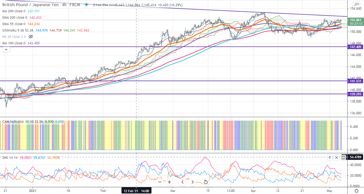 GBPJPY is consolidating in a narrow range between 151 and 152.23 for the past two days. The pound sterling is struggling to close above 1.3900 ahead of Scotland elections and BOE super Thursday. The Bank of England is expected to keep rates unchanged and will continue bond-buying. Markets eye growth projection and hints about QE tapering. USDJPY is choppy due to higher equities and declining bond yields. The intraday trend of GBPJPY is bullish as long support 151 holds.