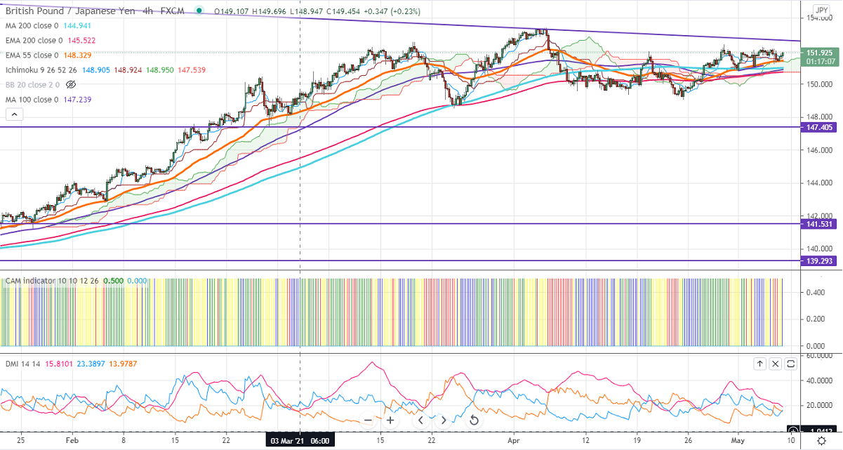 GBPJPY has once again recovered after hitting a low of 151.26. The Bank of England has kept its rates unchanged as expected and slowed its bond-buying program of 3.4 billion a week from its current pace of 4.4 billion pounds a week. It has revised up the economic forecast for 2021 and 2022. USDJPY paired some of the gains on hopes of a rate hike by the Fed. The minor sell-off in bond yields is also supporting the Japanese yen. The intraday trend of GBPJPY is bullish as long support 151 holds.