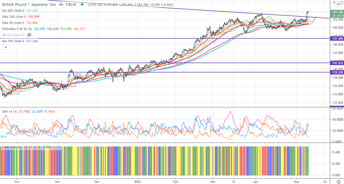 GBPJPY surged more than 150 pips yesterday on the strong Pound sterling. GBPUSD is holding well above 1.4000 on UK local election results and easing of lockdown due to zero deaths in the UK. The pair hits a high of 1.41584 and shown a minor profit booking. Markets eye Bank of England Bailey speech for further direction. USDJPY is trading above 200-W MA and any violation above 109.07 confirms intraday bullishness. The intraday trend of GBPJPY is bullish as long support 153.40 holds.