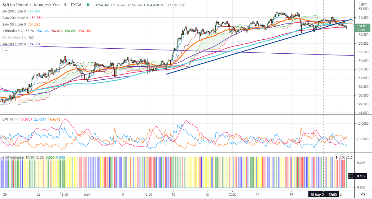 GBPJPY has once again declined after a minor jump above the 154.50 level. The minor sell-off in pound sterling is putting on this pair at higher levels. The pair declined below 1.4150 levels despite upbeat UK retail sales. It came at 9.2% m/m in Apr much better than the forecast of 4.5%. The yearly sales volume surged 42.5% higher than earlier. Any breach below 1.4100 confirms a bearish continuation. USDJPY is trading below 200- day MA and any break below 108.50 will drag the pair to 108. The intraday trend of GBPJPY is bearish as long as resistance 155 holds.