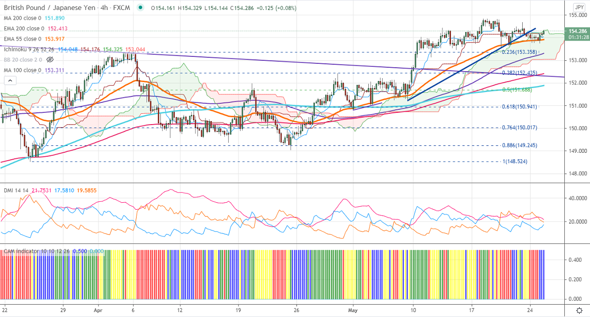 The pair's near-term resistance around 155, any break above will take the pair to next level till 156/156.60. On the lower side, near-term support is around 153.75. Any indicative violation below that level will drag the pair down to 153.35/153/152.39. Significant trend reversal only if it breaks below 147.40.