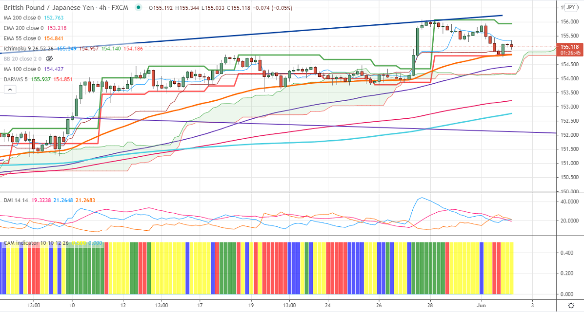 GBPJPY has shown a minor decline after hitting multi-month high art 156.07.is trading in a narrow range between 156.07 and 155.30 for the past four days. The bullish trend in the Pound sterling is supporting the pair at lower levels. GBPUSD surged sharply and hits the highest levels since Apr 2018 on board-based US dollar weakness. The minor surge in the number of coronavirus cases will delay reopening in the UK. USDJPY has halted its five days of the bullish trend. Any surge past 110.20 confirms a bullish continuation. The intraday trend of GBPJPY is bullish as long support 154.60 holds.