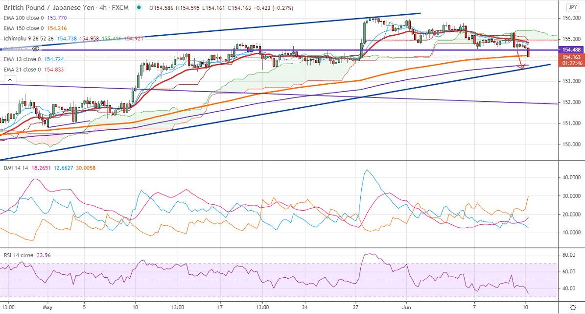 The pair's near-term resistance around 154.85 any break above confirms minor bullishness. A jump till 155.30/155.82/156.10/156.60 is possible. On the lower side, near-term support is around 154. Any indicative violation below that level will drag the pair down to 153.70/153. Significant trend reversal only if it breaks below 153.